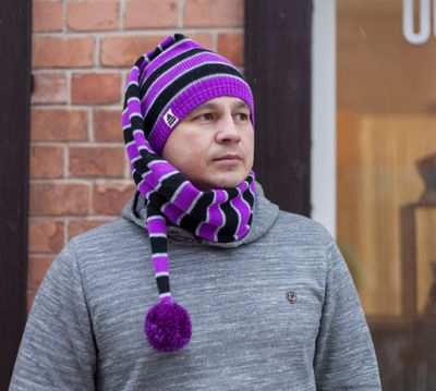 Прикольная шапка-колпак приглушенных тонов и забавной формы сочетает в себе элементы городского стиля и праздничного задора.