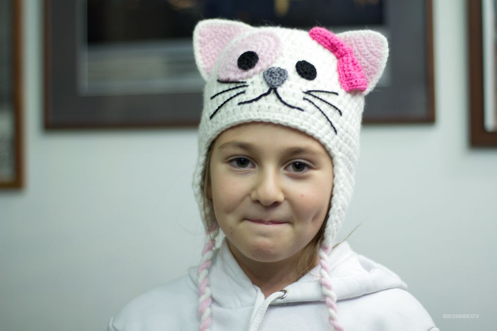Милая, нежная, теплая вязаная шапочка Котенка! Подходит и для маленьких и для больших девочек!