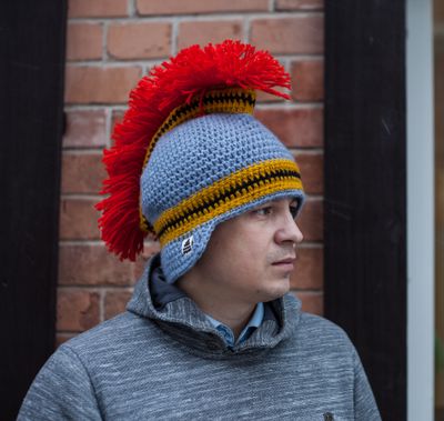 КОлоритная теплая шапка, связанная по образу и подобию рыцарского шлема.