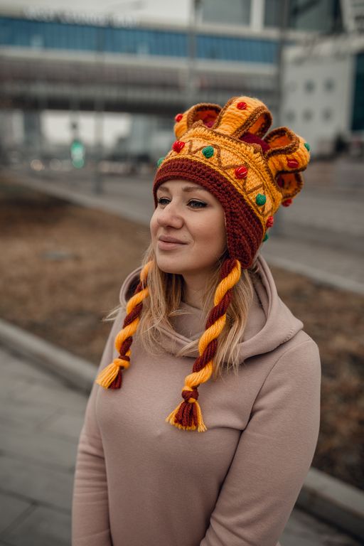 Теплая, неформатная шапка из полушерстяной пряжи, не чешется и не продувается благодаря флисовому подкладу.